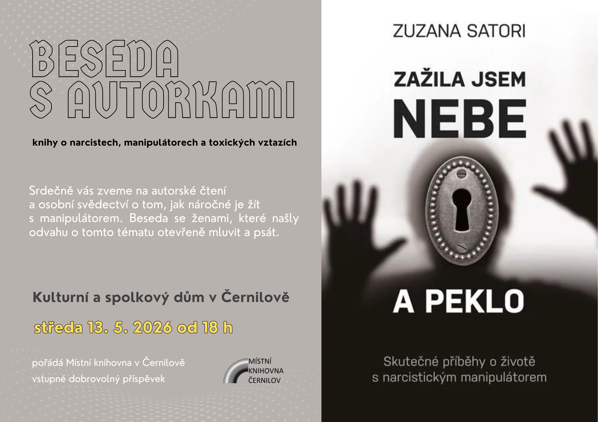 Do Černilova přijede oblíbená spisovatelka, scénáristka a herečka, paní Markéta Harasimová. Srdečně Vás zveme na její Talk show do Kulturního a spolkového domu v Černilově, Černilov 215v pondělí 13. 4. 2026 od 19 hvstupné 100 Kč předprodej vstupenek od 8. 4. 2026 v Místní knihovně v Černilově V úterý 14. 4. 2026 se v KSD Černilov uskuteční ještě přestavení Kočkohrátky s Ťapičkou pro černilovskou mateřskou školu a školní družinu Masarykovy jubilejní základní školy v Černilově
