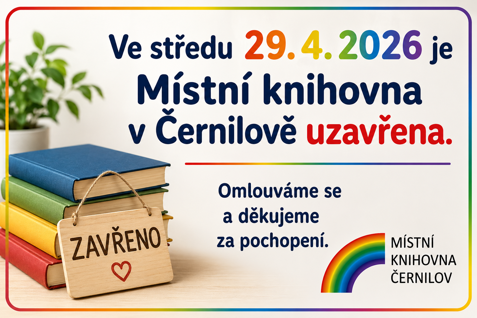 Nejmenší návštěvníky od 0 let zveme ve středu 15. 4. 2026 se svým dospělým doprovodem na program v rámci projektu S knížkou do života / Bookstart, kdy bude Místní knihovně v Černilově otevřena jen pro ně: