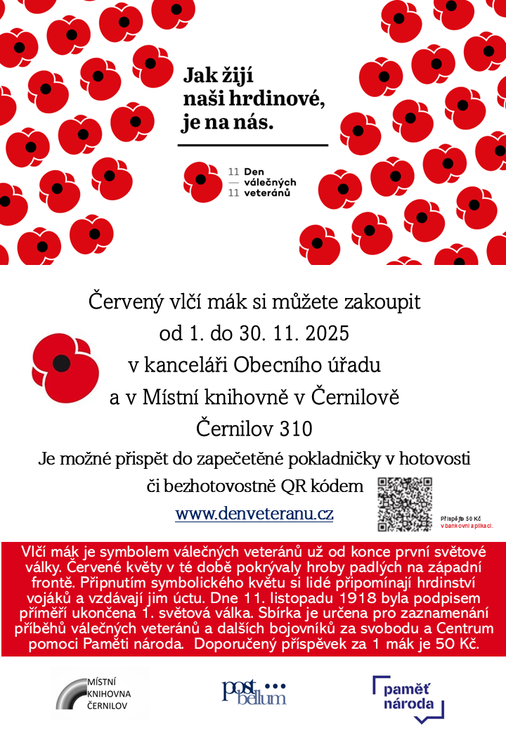 Červený vlčí mák si během celého listopadu můžete zakoupit v naší knihovně a v kanceláři obecního úřadu v Černilově.