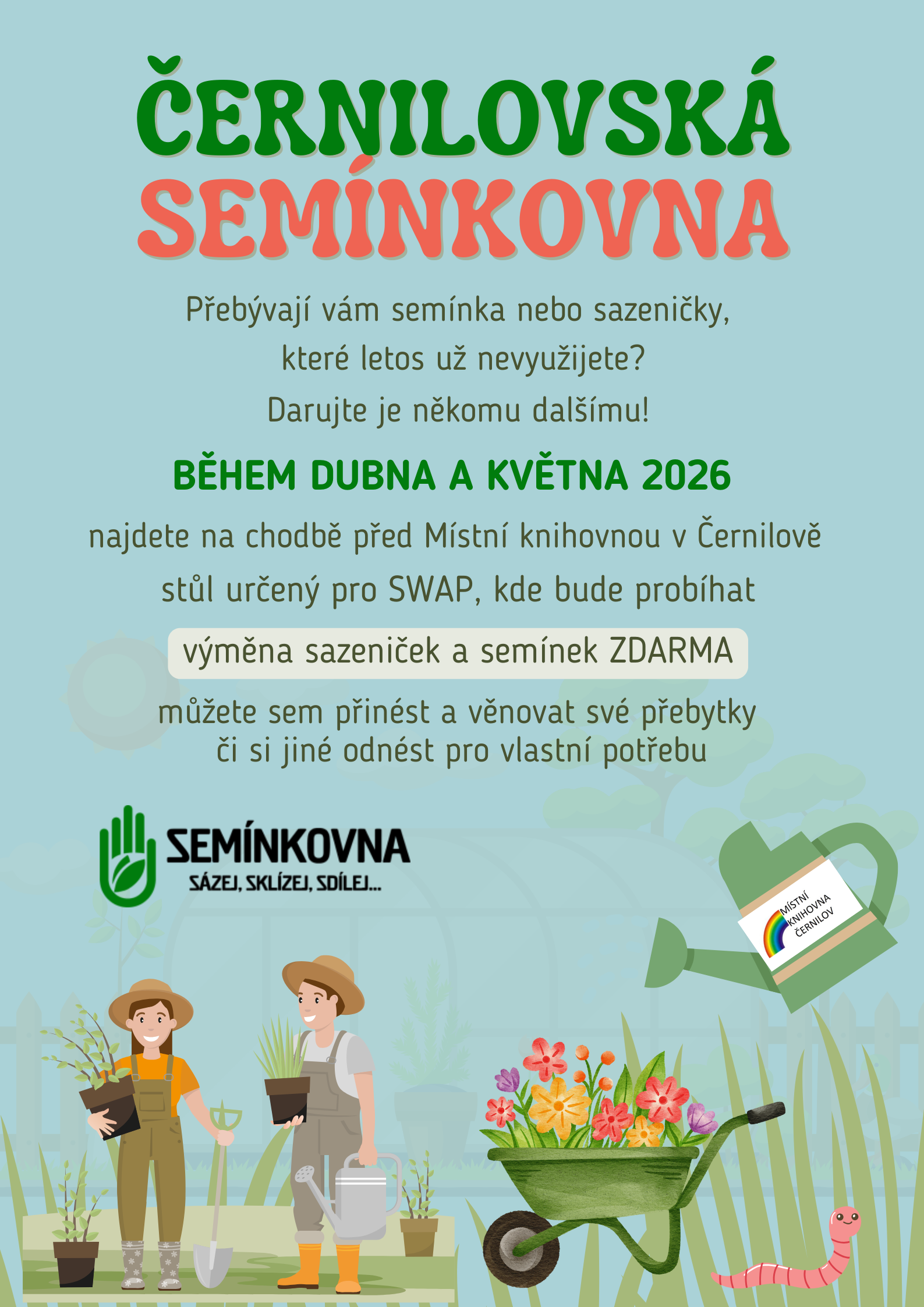 Semínkovna na chodbě před knihovnou zahájila jarní provoz. Můžete si zde vybrat semínka, sazeničky nebo sem přinést vaše přebytky. Semínkovna pro vzájemnou výměnu zde bude fungovat po celý duben a květen. Přejeme vám mnoho úspěchů při pěstování!
